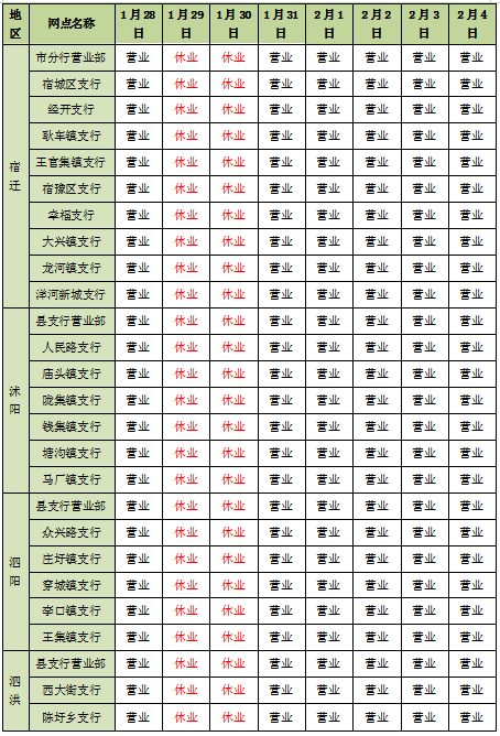 您好!为保障春节期间的金融服务工作,现将春节期间(1月28日-2月4日)我行辖内网点营业时间公告如下: