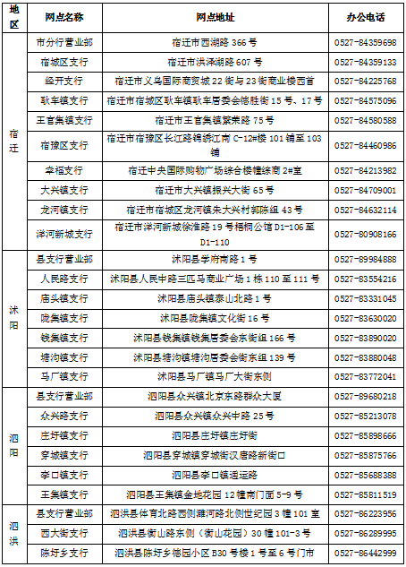 邮储银行宿迁市分行网点信息一览