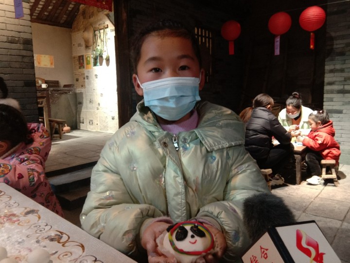 大约30分钟时间,眼前的糯米粉、巧克力酱、奶油和白砂糖就被加工成制作汤圆的的材料。小朋友们在社区志愿者和老师们的指导下,一起包制汤圆。掐面、揉搓、定型,不一会儿造型可爱、憨态可掬的“冰墩墩”汤圆便做好了。