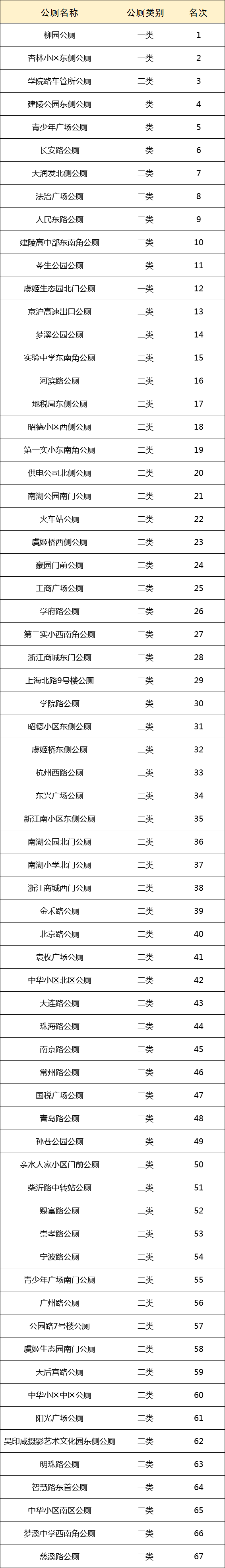 城区室外公共卫生间卫生质量排名