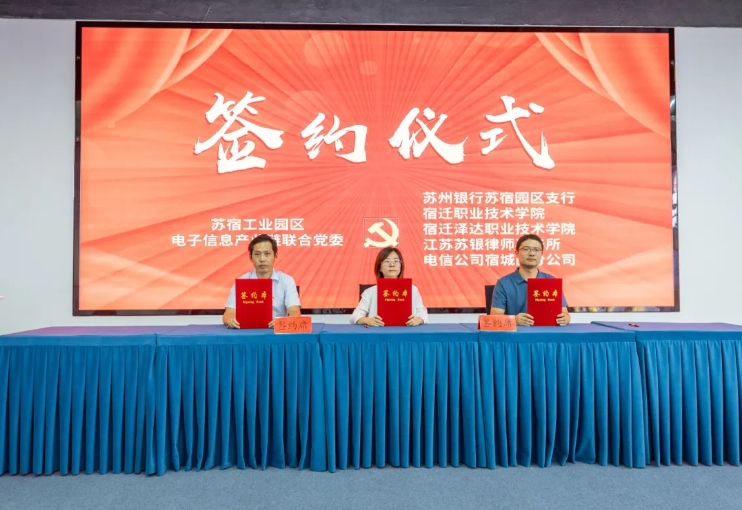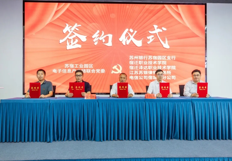 会上,苏宿工业园区电子信息产业链联合党委与苏州银行股份有限公司宿迁苏宿工业园区支行、宿迁泽达职业技术学院、宿迁职业技术学院、江苏苏银律师事务所、中国电信股份有限公司宿迁分公司5家单位签订结对共建协议。