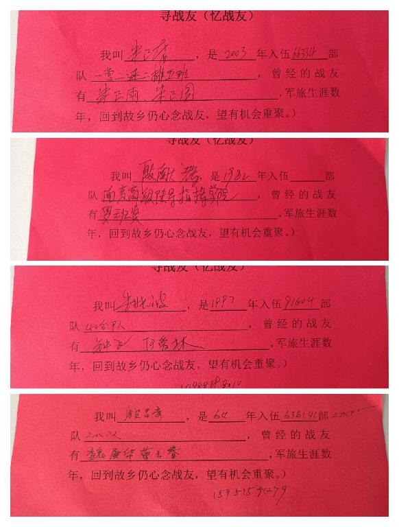 活动中,还设置了“寻战友”内容。大家在纸条上写上自己的姓名、电话,介绍自己的入伍时间,署上战友的姓名,期待能够重聚。在“签名手册”上,大家每人还写上一句退役感悟,同时单独拍照,打印成册,封塑起来。