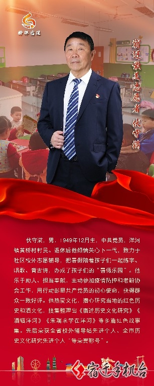 伏守满,男,1949年12月生,中共党员,洋河镇黄桥村村民。退休后他致力于社区校外志愿辅导,把暑假陪着孩子们一起练字、唱歌、背古诗,办成了孩子们的“暑假乐园”。他乐于助人、担当奉献,主动参加疫情防控和老龄协会工作,用行动彰显共产党员的初心使命,获得群众一致好评。他热爱文化,潜心研究当地的红色文化和酒文化,搜集整理出《宿迁历史文化研究》《酒镇洋河》《朱瑞求学在宿迁》等多篇红色故事。先后荣获全省校外辅导站先进个人、全市历史文化研究先进个人等荣誉称号。
