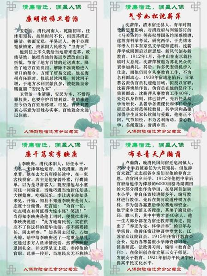 为大力弘扬和培育廉洁文化,夯实清廉从业思想根基,持续推动全面从严治党向纵深发展,人保财险宿迁市分公司纪委办深入探索“文化润廉”新方法,结合宿迁“本地人”廉洁文化故事,创建“清廉宿迁,润盈人保”清廉金融文化特色品牌,将廉洁文化软实力转化为促进业务发展战斗力,以新时代廉洁文化涵养风清气正政治生态。