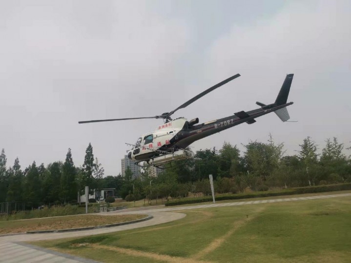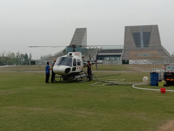 在洋河新区爱情主题公园一处草坪上,一架8米长棕白色直升机,在机组人员的引导下稳稳降落。随着机长发出指令,用来消灭美国白蛾等害虫的白色试剂通过专用管道快速灌入到飞机药仓内。大约两分钟,加满试剂的直升机便飞向空中。每经过一片树林,机长都会按下按钮,喷洒药物。