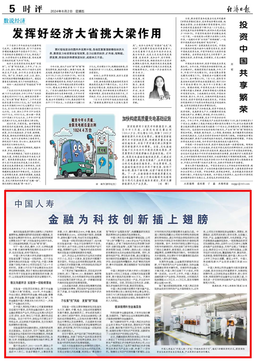近日出版的《经济日报》,以《金融为科技创新插上翅膀》为题,报道中国人寿作为国有大型金融机构,全面践行金融工作的政治性、人民性,进一步发挥好保险经济减震器和社会稳定器功能,加快构建科技金融服务生态,服务新质生产力发展。