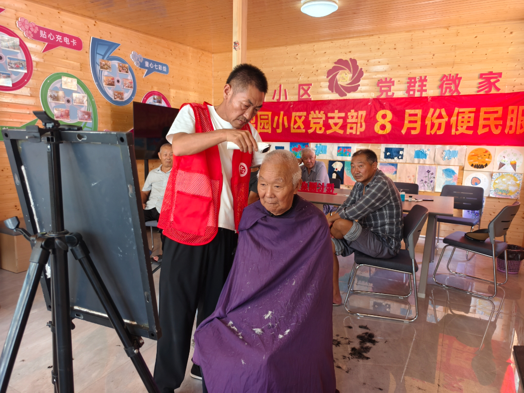 在梨园小区党群微家内,志愿者蔡新全正在为居民进行理发,活动现场,居民领好号牌,有序排队等候,活动流程井然有序。 等候间隙,小区网格员还贴心地为居民测量血压、血糖。