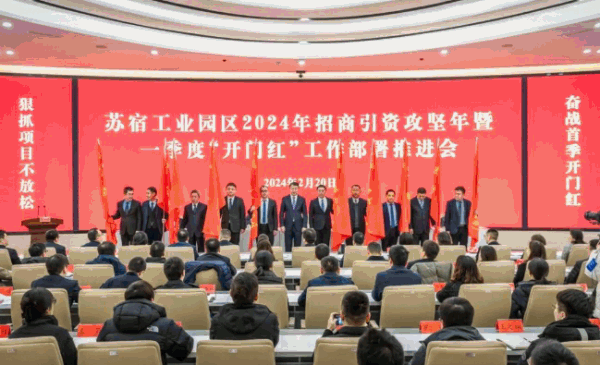2月20日,苏宿工业园区召开2024年招商引资攻坚年暨一季度“开门红”工作部署推进会。副市长,苏宿工业园区党工委书记、管委会主任李朝阳出席会议,为获评2023年度招商引资工作先进单位颁奖,向园区招商队伍代表授旗。他强调,要以“开局就是决战、起步就是冲刺”的工作状态,聚力聚焦招商引资第一使命,以昂扬的斗志、务实的作风,举全区之力,下非常之功,持续开展“招商引资攻坚年”活动,以项目引建大推进实现园区高质量发展动能大提升。苏宿工业园区党工委副书记、管委会副主任徐丽丽主持会议,并安排部署一季度“开门红”工作。