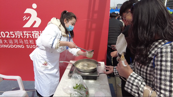 乾隆贡酥金黄酥脆、散发着诱人的香气,让人一口咬下便欲罢不能;鱼头饺子则以新鲜肥美的鱼头熬制汤底,饺子皮裹着精心调制的馅料,在鲜美的鱼汤中翻滚,入口既有鱼肉的鲜嫩,又有饺子的醇厚,两种风味完美融合,令人回味无穷;骆马湖特色水产品——银鱼、咸鸭蛋等,原汁原味地呈现出骆马湖水产的独特鲜美,每一道都吸引着众多跑者及市民纷纷驻足。他们一边品尝着美食,一边对湖滨新区的特色风味赞不绝口。