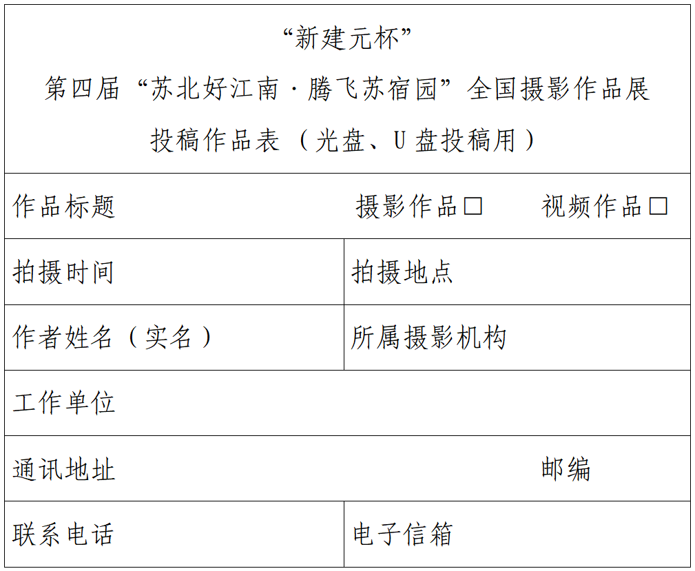 投稿作品以光盘(CD-R或DVD-R)、U盘存储形式邮寄至:北京市东城区东四十二条48号中国摄影报社活动项目部第四届“苏北好江南 腾飞苏宿园”全国摄影作品展办公室(100007)投稿热线:010—65251661。光盘、U盘包装盒上注明该作品征集的名称。无相关资料的投稿作品,主办单位有权取消其参评资格。