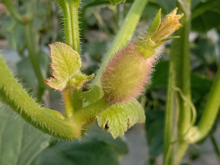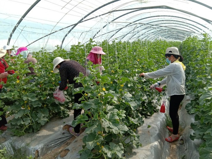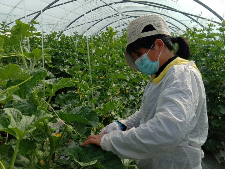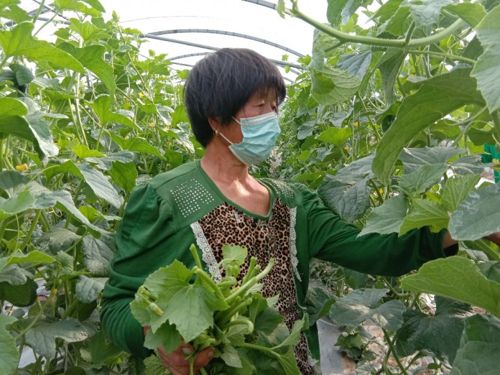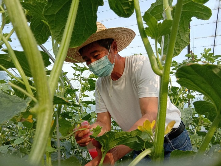 早上八点多,瓜棚里早已忙碌起来。工人们穿梭在瓜藤边,寻找瓜纽,进行人工授粉。由于藤蔓茂盛,有的瓜纽被遮住,工人寻找起来很吃力。为了指导工人提升授粉效果,老高来回奔波着,大家也是学得很快。能在短时间内快速发现小手指头大小的瓜纽,并完成授粉需要眼疾手快。