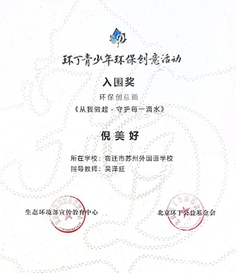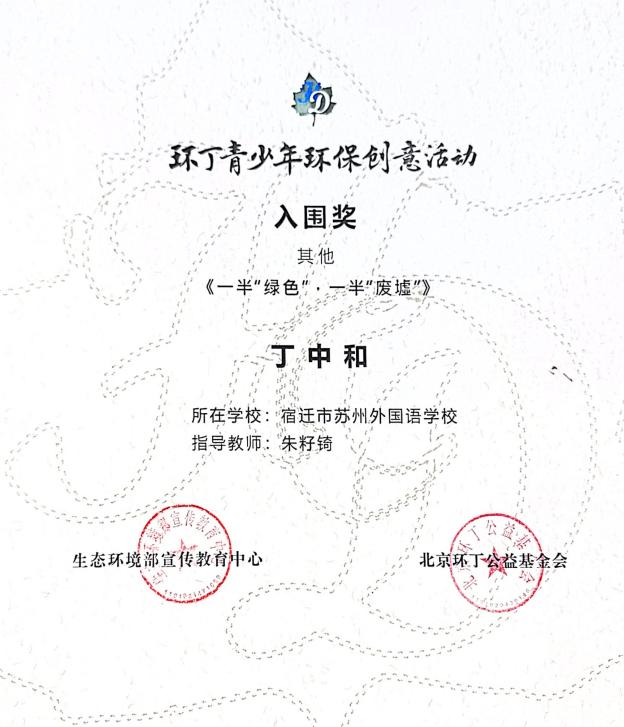 近日,生态环境部宣传教育中心和北京环丁环保大数据研究院联合主办的全国环丁青少年环保创意大赛(以下简称“环丁大赛”)结果揭晓,宿迁市苏州外国语学校一年级20班丁中和、五年级13班倪美好同学的作品从全国一千多件作品中脱颖而出,荣获大赛入围奖。