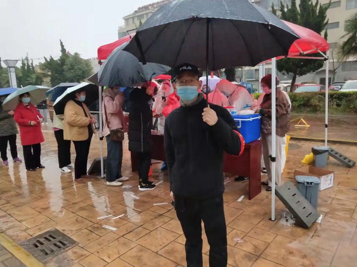家住沭城街道金地鑫诚小区的税务局党员陈伟,看到小区门口排起长长队伍,恰逢接送孩子高峰期,造成进出车辆严重拥堵,曾经当过兵的他主动承担起交通疏导员,维持交通秩序,突然下起了瓢泼大雨,衣服被淋湿,他也全然不顾,在大雨中坚持工作。