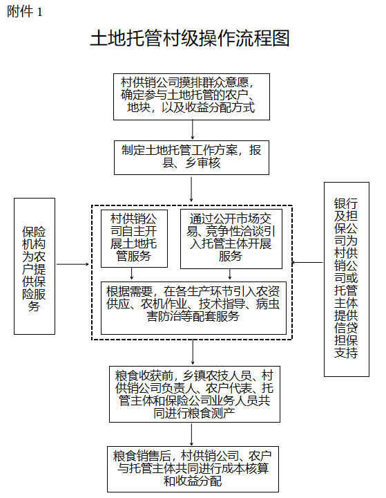 (三)稳慎组织实施。乡镇(街道)要做好基础工作,指导村(居)开展群众意愿摸底,确定实施土地托管的村(居)。要引导村供销公司与农户、服务组织规范签订服务协议,强化内容约束和可追溯管理。要发挥村党组织功能,做好服务过程中的矛盾化解工作。强化民主监督,引导农户代表、村供销公司积极参与服务监管和质量监督。