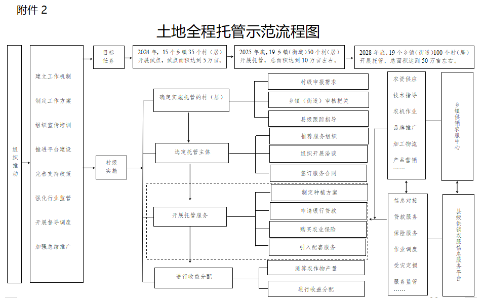 按照省、市相关工作要求和市委组织部、市农业农村局、市供销合作总社《关于开展“党建引领 村社共建”发展村集体经济活动的通知》等精神,以构建新的供销基层体系为主线,以“党建引领 村社共建”活动为抓手,共建县乡村供销服务平台,创新农业经营方式,试点推广农业生产“耕、种、管、收、售”土地全程托管服务模式,集成推广良田良种良机良法,提高粮食单产,提升农业综合效益,促进小农户和现代农业有机衔接,聚焦解决“谁来种地”问题,保障粮食安全,提升村集体经济组织和村民收入,为全县加快农业农村现代化提供有力支撑。2024年,在全县选择15个乡镇35个村(居)开展土地全程托管试点,试点面积达到5万亩;到2025年底,在全县19个乡镇(街道)50个村(居)开展全程托管,服务面积达到10万亩;到2028年底,在全县19个乡镇(街道)100个村(居)开展土地全程托管,力争托管总面积达到50万亩。