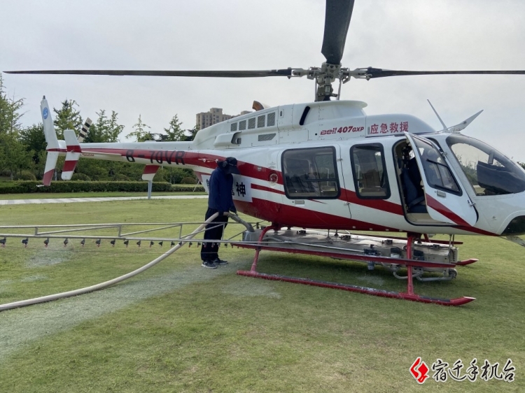 在洋河新区爱情主题公园一处草坪上,一架8米长红白色直升机,在机组人员的引导下稳稳降落。随着机长发出指令,用来消灭美国白蛾等害虫的白色试剂通过专用管道快速注入到飞机药仓内。大约两分钟,加满试剂的直升机便飞向空中。每经过一片树林,机长都会按下按钮,喷洒药物。