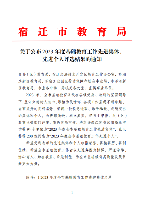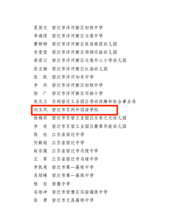 近日,宿迁市教育局发布《关于公布2023年度基础教育工作先进集体、先进个人评选结果的通知》,宿迁市苏州外国语实验学校获评“2023年度全市基础教育工作先进集体”,宿迁市苏州外国语学校刘玉凤获评“2023年度全市基础教育工作先进个人”。