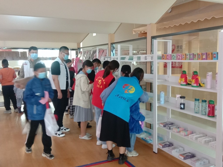 走进六里棚社区,一间40平方张贴“人道 博爱 奉献”字样的六里棚社区红十字博爱超市映入眼帘,超市里摆放着铅笔、书包、本子、茶杯等,10多个孩子正在志愿者们的陪伴下,免费挑选文具等学习生活用品。