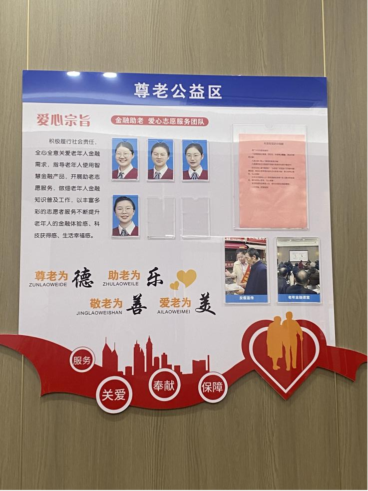 走进兴业银行沭阳支行,温馨之感扑面而来。网点内专门设立了“尊老公益区”,醒目的标识下,一幅幅温暖的画面映入眼帘。这里展示着一系列公益活动的照片,还有“尊老为德、助老为乐、敬老为善、爱老为美”的标语,彰显着对老年群体的尊重与关爱。这个区域不仅仅是一个展示空间,更是银行传递尊老敬老理念的窗口。