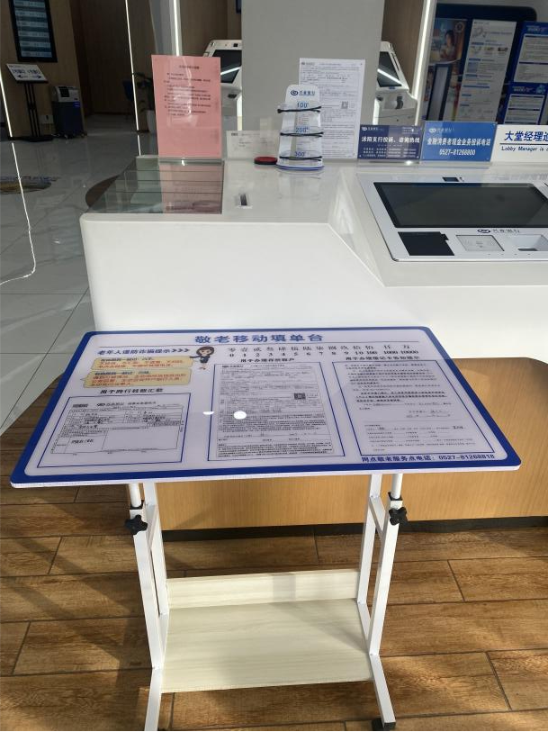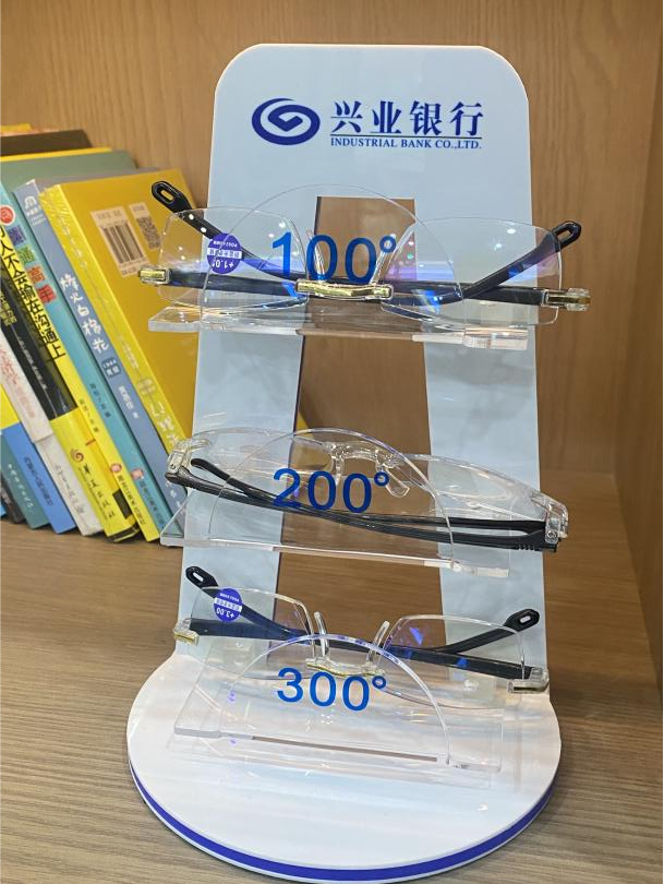 考虑到老年客户在办理业务时可能会遇到的各种不便,网点配备了一系列贴心的适老化设施。例如,放置在桌上的眼镜架,上面贴心地标有不同度数,方便视力欠佳的老年客户使用。除此之外,网点还设有无障碍通道、舒适的座椅和稳固的扶手等,全方位保障老年客户在网点内的行动安全和便利。