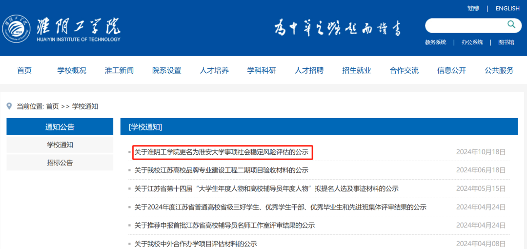 近日,淮阴工学院在学校官网上发布了《关于淮阴工学院更名为淮安大学事项社会稳定风险评估的公示》。