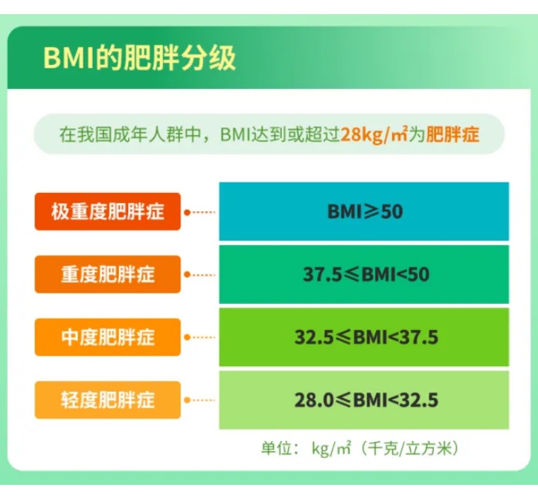新指南根据患者的身体质量指数(BMI)将肥胖症分为4个级别。BMI计算公式为:体重(公斤)除以身高(米)的平方(kg/m2)。BMI达到或超过28kg/m为肥胖症。