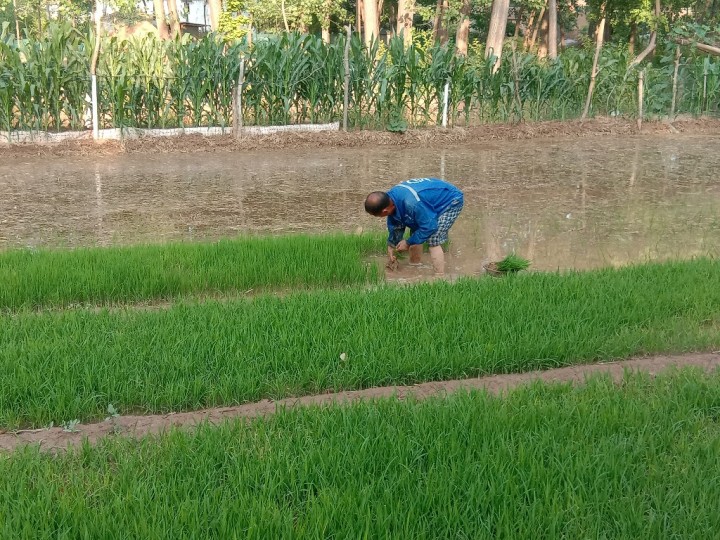 我们现在各个沟渠里面都有水,老百姓用水也很方便。我们现在正在打些水,回去之后给小秧泡泡,准备过两天移栽的。