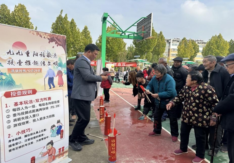 活动现场,社区特别设置了多个传统民俗体验区。“墨韵话重阳”书画创作区内,书法爱好者们挥毫泼墨,用毛笔书写咏菊诗词,描绘秋日胜景;“投壶雅趣传文明”区域欢声不断,这项起源于春秋时期的传统游戏让居民们在体验中感受古人的雅趣;“怀旧茶话会”上,老人们围坐在一起,品着重阳糕、喝着菊花茶,畅谈往昔岁月,分享人生感悟。