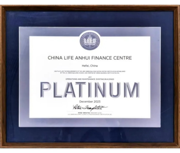 图:中国人寿安徽金融中心获得LEED铂金级认证