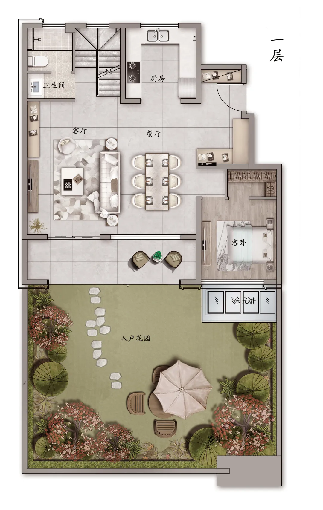 更好的叠墅应该兼顾到每位家人的社交需求,下叠一层空间以“厅”为主,餐厅、客厅开放无界。