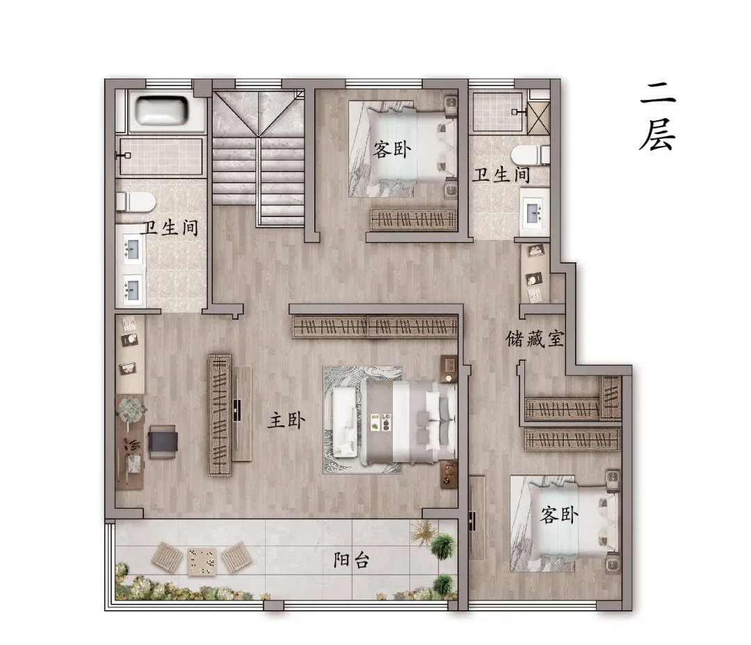 二层整层静谧卧室格局规划,对于居者而言,是一方自由放松的私属天地。下叠卧房层,或南北通透、或向阳而居、或静于一隅,满足主人喜欢尊崇、老人喜欢安静、孩子喜欢向阳的需求。