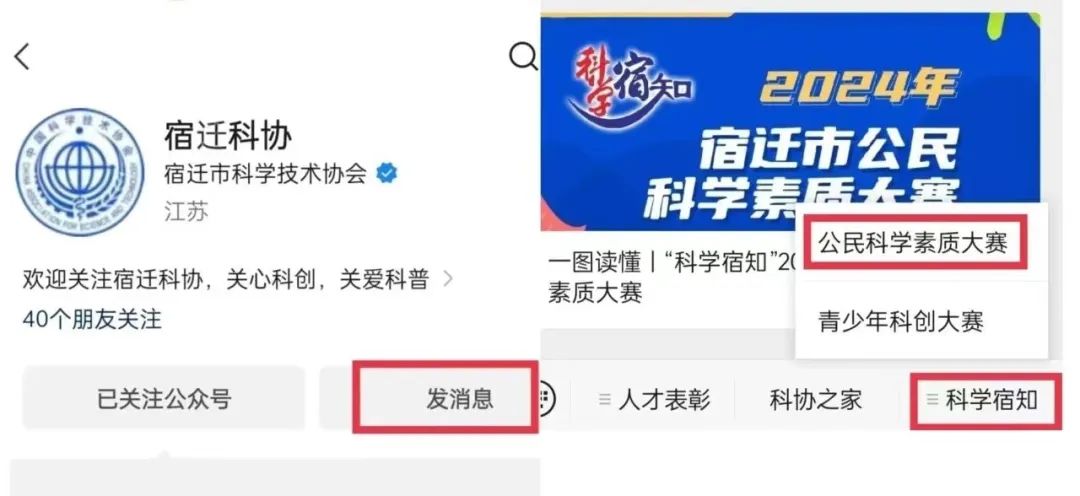 线上参赛渠道:关注“宿迁科协”微信公众号,点击“发消息”进入底部菜单栏,然后依次点击“科学宿知”、“公民科学素质大赛”,即可参赛。