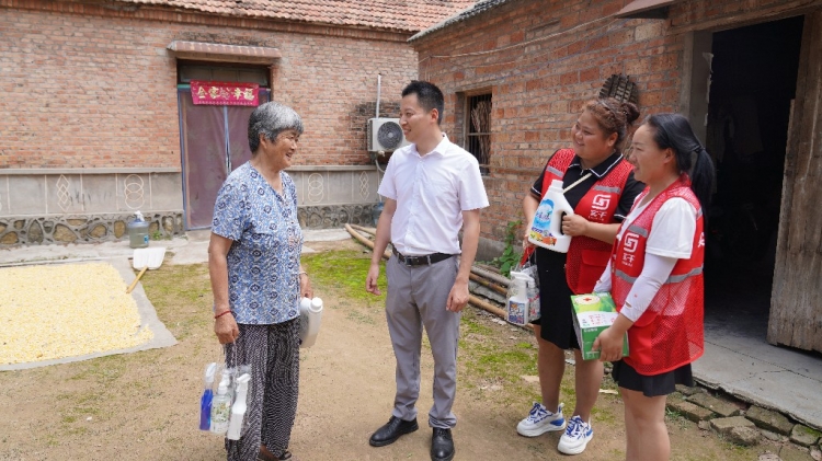 走进大沟村党群服务中心红十字博爱家园,屋内博爱超市货架上摆满了牛奶、洗衣液等生活物资。30户特殊困难家庭的老人和孩子正在志愿者们的陪伴下,免费领取生活用品。