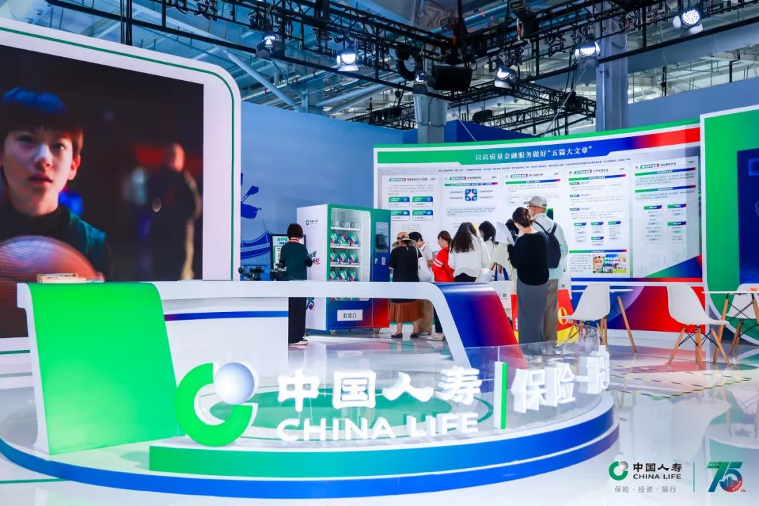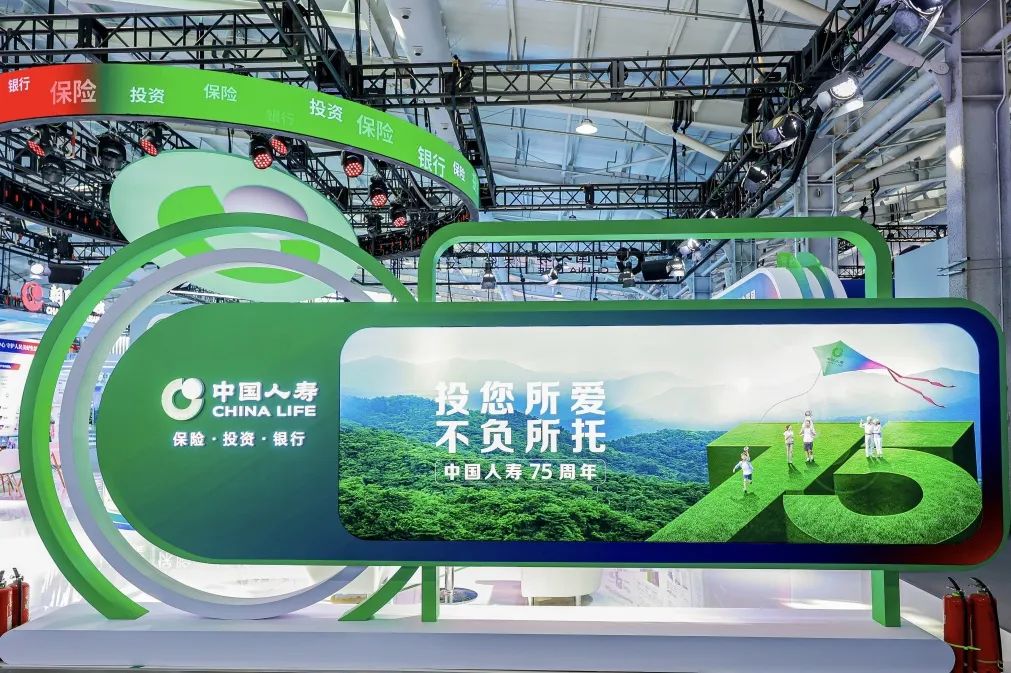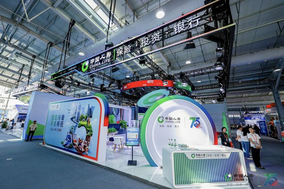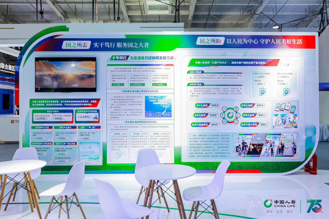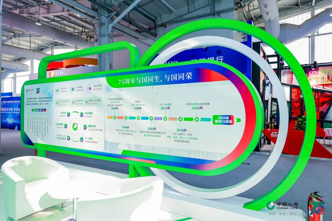 中国人寿展台以代表保险板块的绿色、代表投资板块的蓝色、代表银行板块的红色为主色调,围绕“服务国家发展大局 守护人民美好生活”主题,设置“75周年与国同生,与国共荣”“以高质量金融服务做好五篇大文章”“实干笃行 服务国之大者”“以人民为中心 守护美好生活”等板块,积极展现公司发挥行业头雁作用,汇聚综合金融优势,一体化发展取得的各项成果。