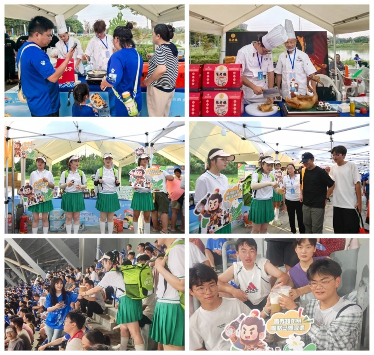 下午4时许,奥体中心体育场外的“优品市集”已人头攒动,张老鹅的卤香与鱼头饺子的鲜香在空气中交织,引得球迷们纷纷循香而来,而最引人注目的当属骆马湖牌啤酒的销售盛况,除了固定摊位外,宿迁骆马湖水产集团还组建了一支专业销售团队——身着统一制服的工作人员背着特制的啤酒包,穿梭在摊位之间,她们手中冰镇的骆马湖牌啤酒杯身凝结着晶莹的水珠,在阳光下折射出琥珀般的光泽。“来两杯!”球迷们纷纷招手,工作人员熟练地用啤酒包倒酒,金色的酒液在杯中翻涌出细腻的白色泡沫,清脆的碰杯声此起彼伏,为即将开始的比赛奏响前奏。