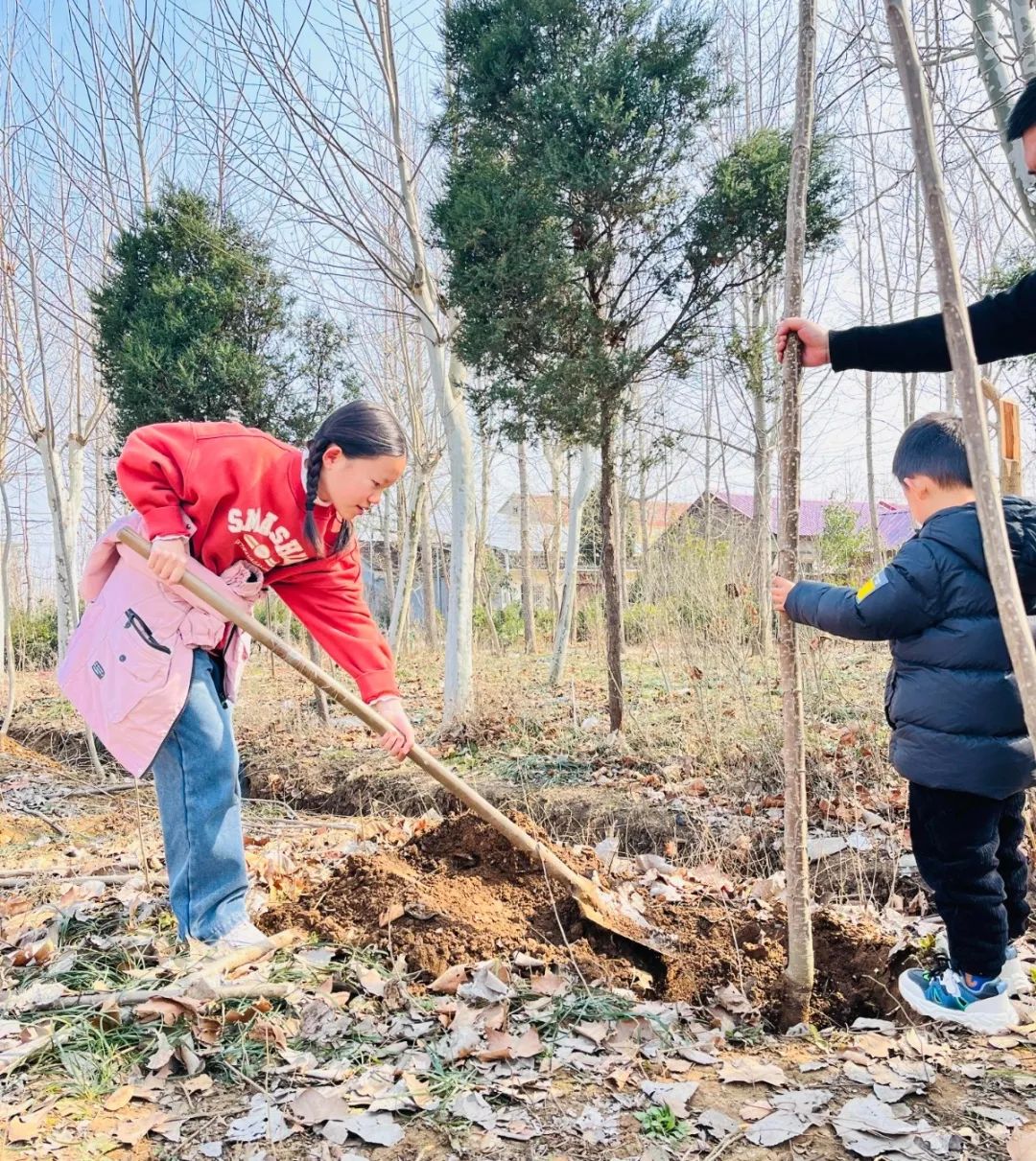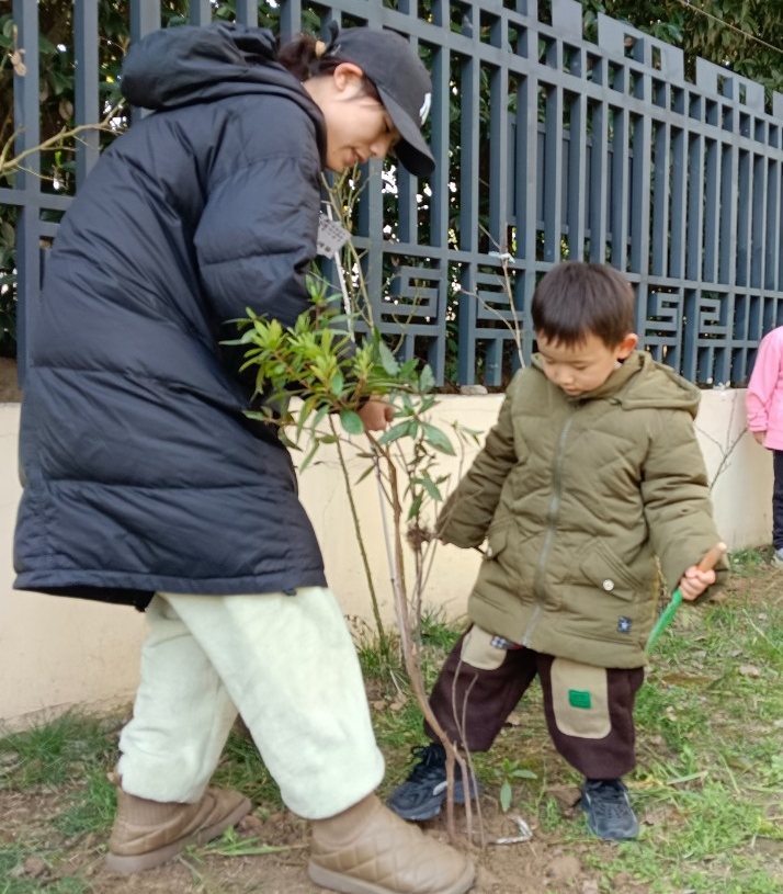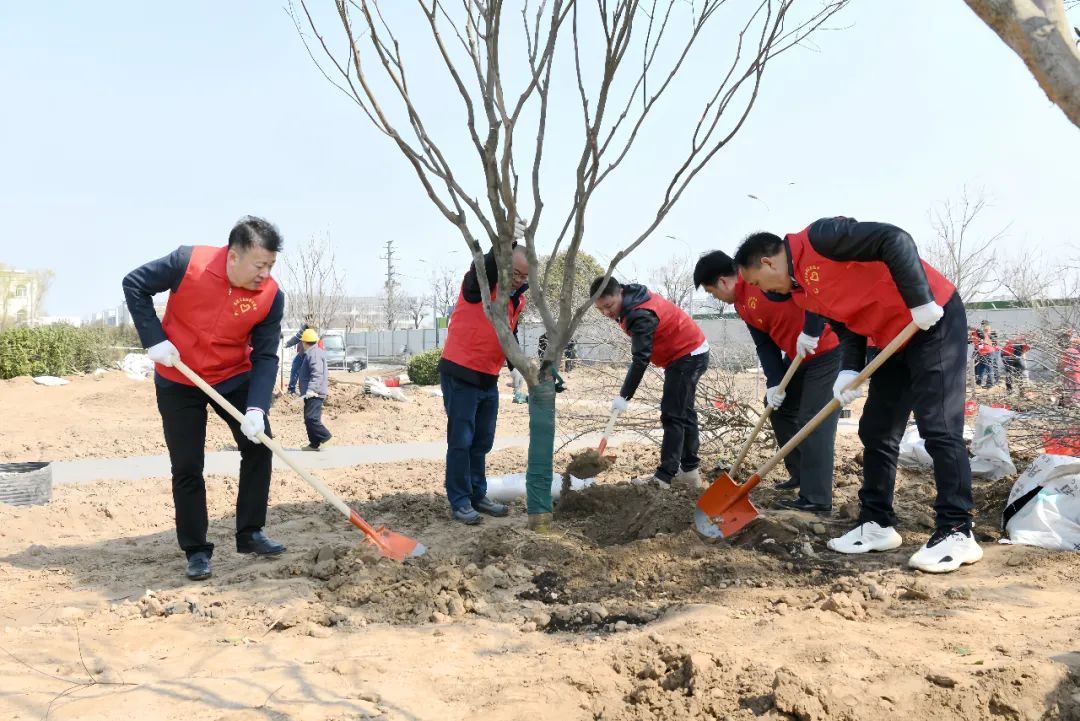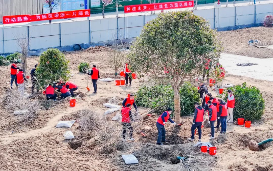 上午10时许,大家拿好植树工具,到达植树点,按照划分的种植区域,两人一队,三人一组,分工明确,配合默契,有的拿铁锹刨坑,有的拿水桶浇水,还有的手扶苗木,将一颗颗青春的树苗,栽种到大美园区的沃土中,在大好春光中种下春天的希望。经过一番辛勤劳作,200余棵桂花、红枫、鸡爪槭、垂丝海棠、早樱等苗木错落有致、迎风挺立,嫩绿的枝叶在和煦的微风中轻轻摇曳,焕发出勃勃生机。