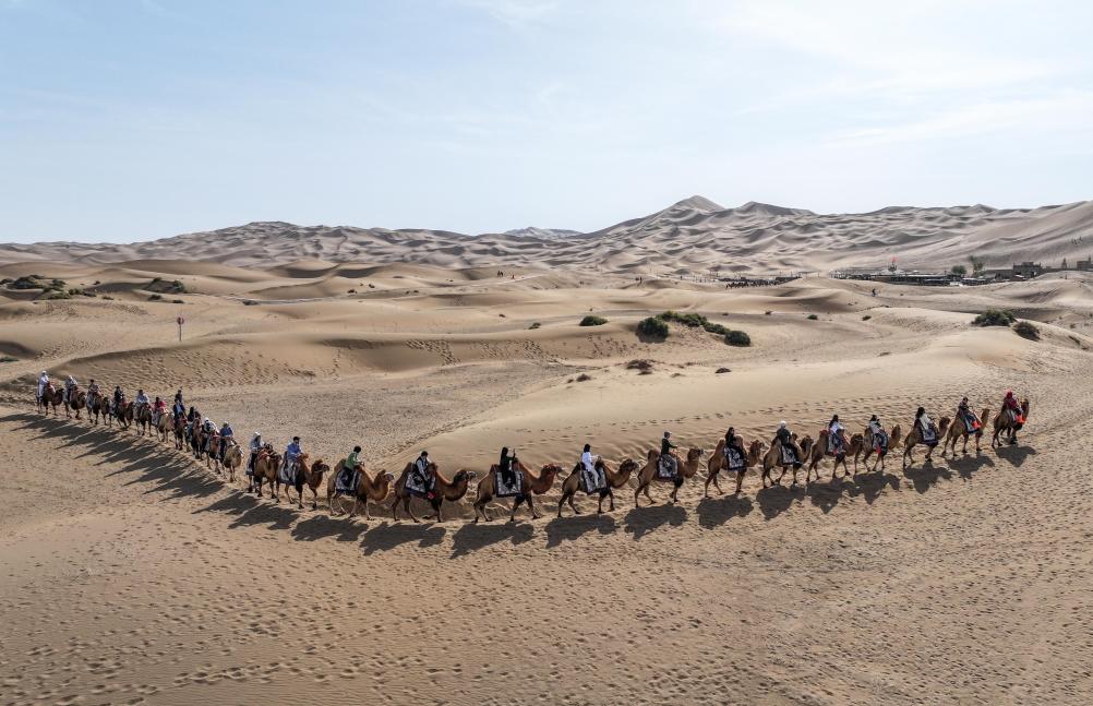 10月16日,与会嘉宾在位于新疆吐鲁番市鄯善县的库木塔格沙漠体验骑骆驼(无人机照片)。第六届世界媒体峰会10月14日上午在乌鲁木齐开幕。峰会期间,与会嘉宾在新疆多地参访。新华社记者陈晔华摄