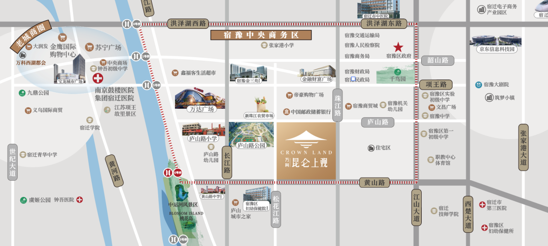 除了优越的商业教育资源,项目所在地还是城市难得的健康宜居高地,庐山路公园与项目仅一路之隔,出门楼下即公园,并且近享京杭大运河、桃花岛、千鸟园等自然休闲资源,是全家人出门游玩、休闲露营,亲近自然的好去处;宿豫妇幼保健医院隔路相望,平时不拥堵,用时举步达。(信息源自百度地图,学区划分、招生条件以当年教育主管部门招生公告及校方自主要求为准。)