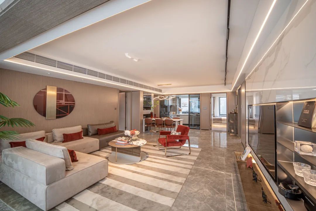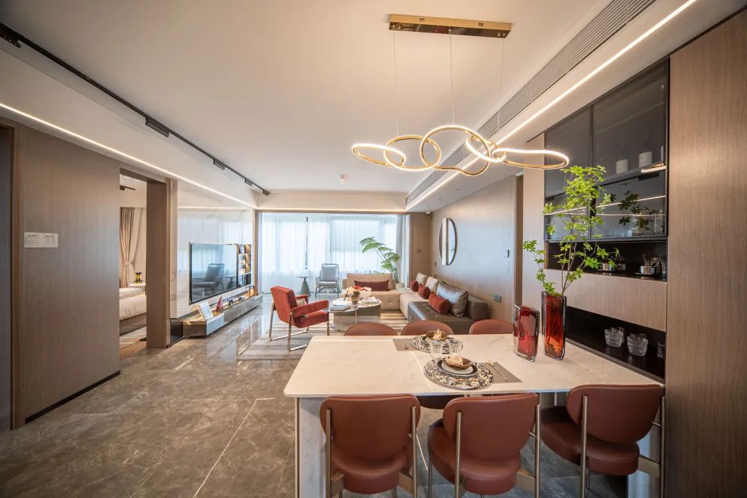 项目以摩登东方风、自在快活感、老友情谊范、乘风破浪劲、混龄生活场五大维度,脱颖而出、东方门第、四水归堂、贵在所在、静心庭院、登堂入室的六进礼序,将东方底蕴与摩登风格融合生成17大生活场景。