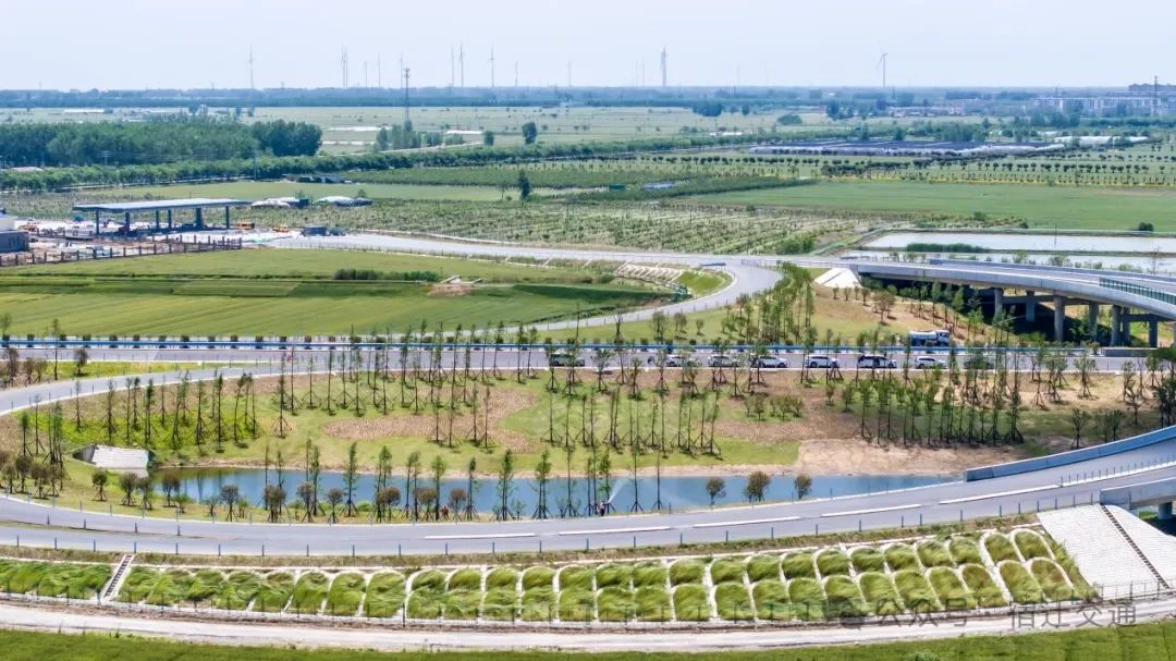 在高速公路建设领域首次引入绿色中心管理模式,建立以项目办+绿色中心+监理单位+施工单位的“四位一体”的绿色管理体系,明确施工期裸土覆盖、声环境、水环境、大气环境等方面要求,开辟绿色建造九大板块,采取边建边绿、土方覆盖等10大项必要生态保护措施,建立三级环水保管控体系,布设27处网格化大气监测点位,累计识别施工现场绿色风险源110项,绿化面积达21.3万平方米。编制了《绿色建设关键技术与监测体系技术指南》《高速公路施工碳排放核算指南》2项团体标准,让绿色成为项目的最亮底色。在实施一系列绿色举措的同时,结合地域文化特点,将绿色理念融入建筑景观设计,泗洪服务区设计凸显了“水韵名城”主题,采用蓝白交汇的建筑色彩,外立面为生动流畅的水纹图样,充分与沿线自然环境和谐相融。