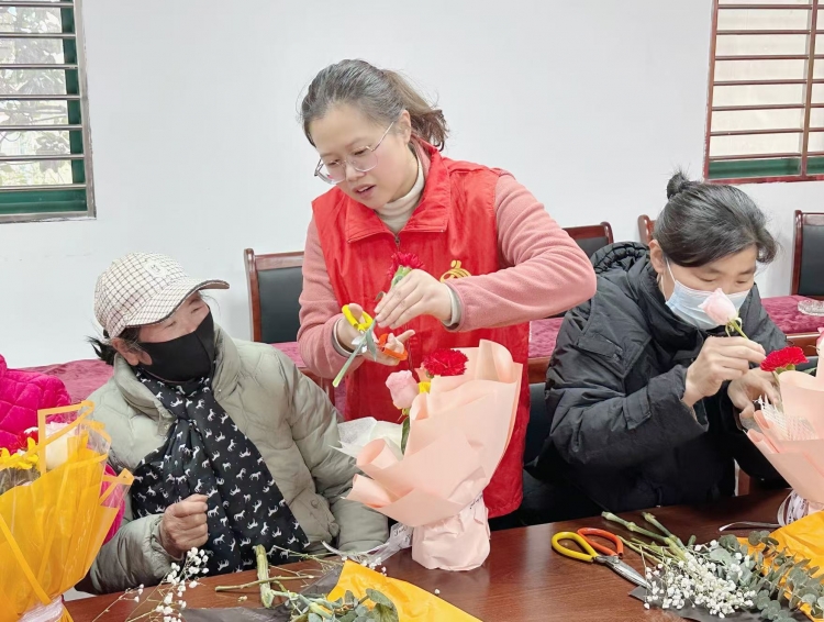 在晓店社区党群服务中心,专业花艺师细致传授着插花技艺,从玫瑰的热烈、康乃馨的温柔到洋桔梗的雅致,带领大家认识花材、学习配色、掌握造型技巧。现场的女性代表们认真聆听着,尽情发挥创意,修剪枝叶、搭配色彩、调整造型,将一枝枝鲜花化作一份独具匠心的艺术品。