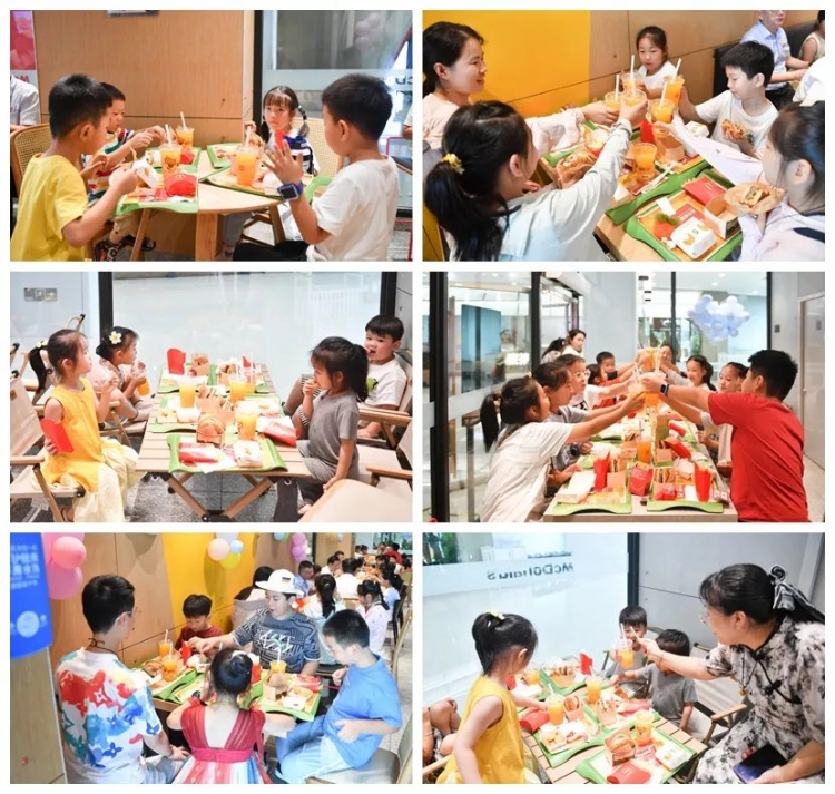 “这个汉堡真大呀!”“这个薯条也非常好吃!”……孩子们兴奋地交流着,餐厅里处处充满欢乐。张先彦走到孩子们中间,帮助孩子们整理餐盘,并通过言传身教引导孩子们爱惜粮食,自觉践行“光盘行动”。