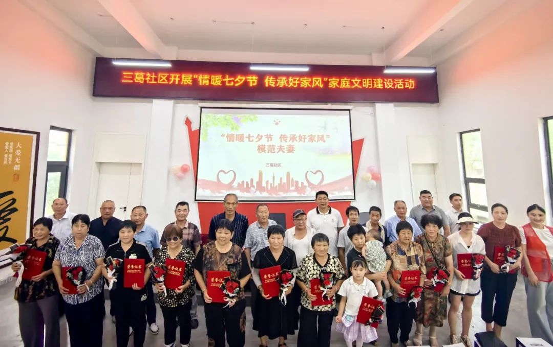 8月22日,在七夕节这个特别的节日里,三葛社区党总支围绕“情暖七夕节 传承好家风”家庭文明建设主题,隆重举行了模范夫妻颁奖典礼,对获奖的13对夫妻进行了表彰和颁奖。