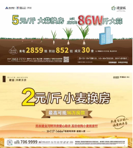 以小麦换房,来自河南商丘市民权县一个名为建业河畔洋房的项目,其内容为“2元/斤小麦换房,最高可抵16万房款”。而以大蒜换房的项目,同样位于河南省,为建业在开封市杞县开发的建业城,其内容为“5元/斤,大蒜换房”。
