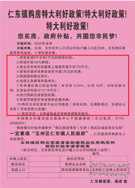 今年以来,玉林市仁东镇发布了一系列购房利好政策,其中包括买房“送工作”。当地负责向进城购房且未就业的新市民推荐3个以上就业岗位,薪酬不低于玉林最低工资标准。