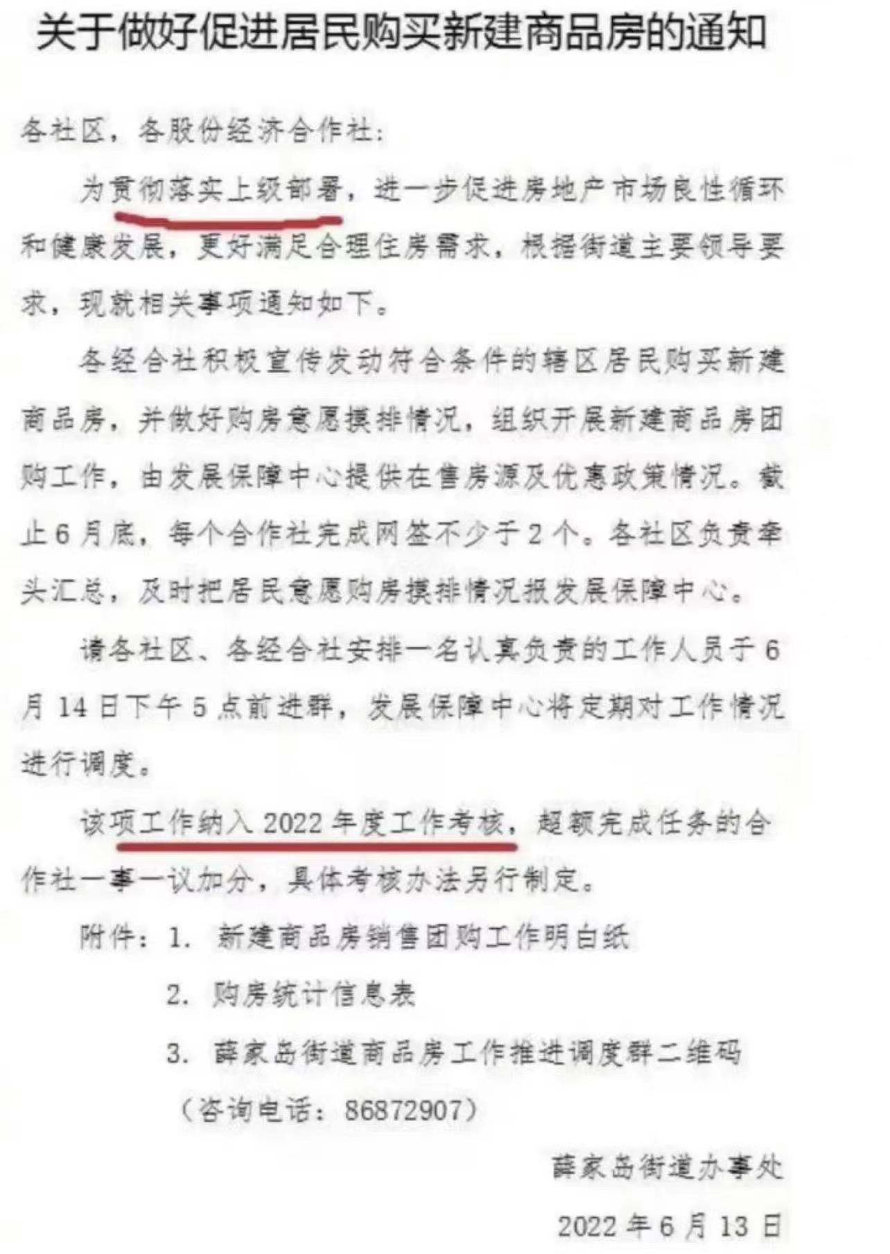 日前,青岛市西海岸新区某街道办事处一则名为《关于做好促进居民购买新建商品房的通知》广为流传。该通知要求各社区、各股份经济合作社,发动辖区居民购买新建商品房,组织新建商品房团购,至6月底每个合作社完成网签不少于2个,并将该项工作纳入2022年度工作考核。