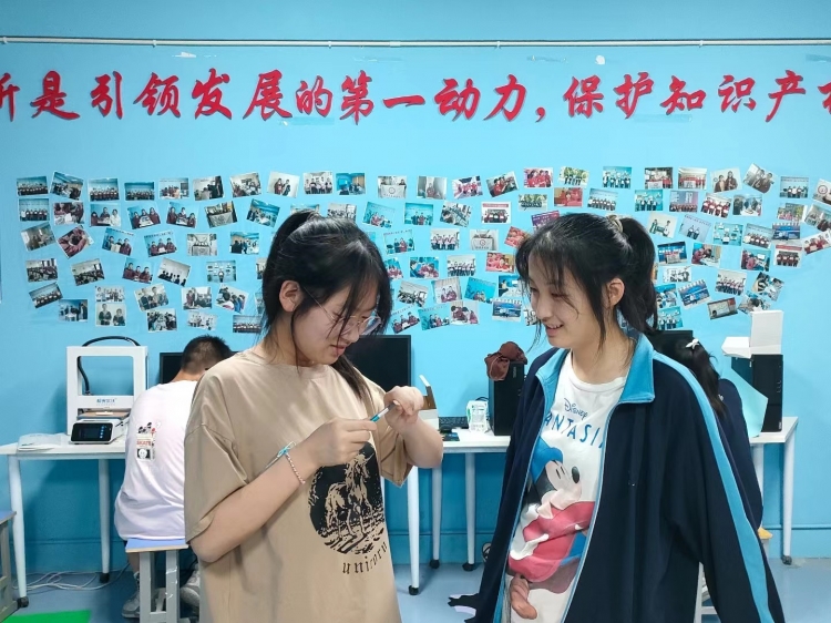 科技创新社史函羽和李好同学在对仿生机器人的轮子进行改进