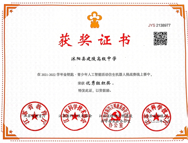 近日,江苏省中小学生金钥匙科技竞赛组委会公布了 2021—2022 学年青少年人工智能活动仿生机器人挑战赛的获奖结果(该赛事系江苏省教育厅审核通过的2021—2022学年全省中小学生竞赛活动项目,大赛由江苏省教育厅立项,江苏省科学技术协会、江苏省精神文明建设指导委员会办公室、江苏省科学技术厅主办)。沭阳县建陵高级中学代表队荣获一等奖1项,二等奖4项,三等奖1项。张令臣老师荣获“省级优秀指导老师”,沭阳县建陵高级中学喜获“省级优秀组织奖”。