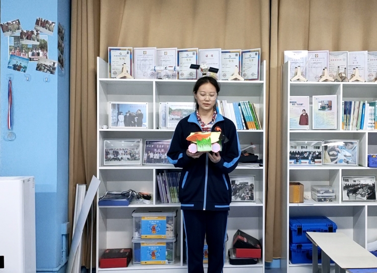 杨思琪同学在展示小组设计的作品并进行现场解说
