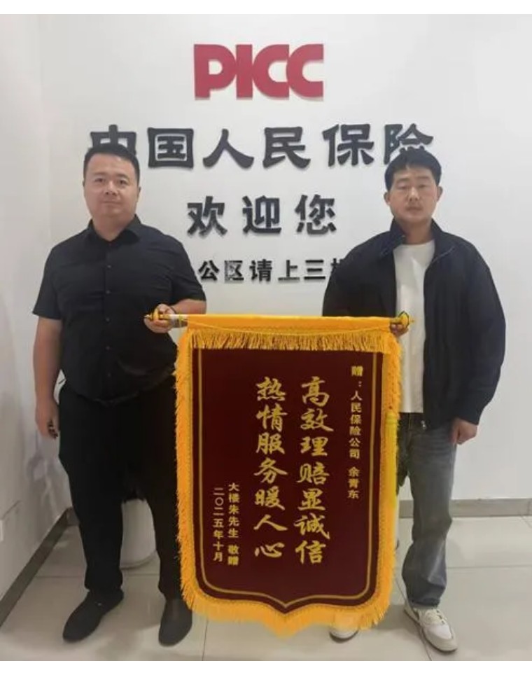 近日,人保财险宿迁泗洪支公司收到一面写着“高效理赔显真诚、热情服务暖人心”的锦旗。